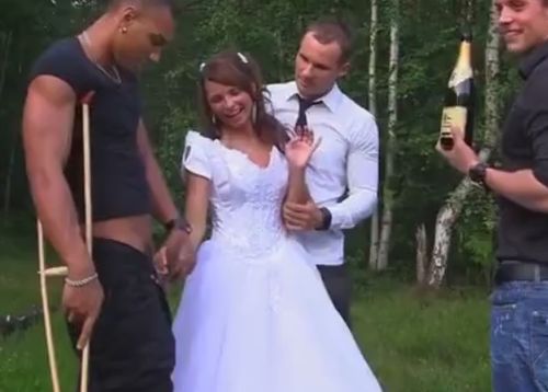 Дружки и жених прославленной русской шлюхи Меган Вале (Валентины Азаровой), решившей связать себя узами брака, после свадьбы отправились бухать на природу, где нарядная пьяная невеста пошла по рукам. Отметить бракосочетание групповой еблей в лесу захотел именно новоиспечённый муж распутной блудливой девки, которую ебали по кругу все кому не лень, да ещё и снимали на видео. Счастливая молодая жена в пышном свадебном платье, дающая всем подряд, надолго запомнит незабываемую групповуху с друзьями, что толпой спускали ей на лицо под конец праздничной мммж оргии.
