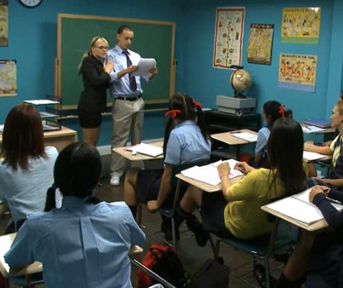 Единственный парень в учебном классе был вызван с докладом к школьной доске, но предательски выпирающий хуй из его штанов быстро привлёк внимание училки и одноклассниц. Пошлые шутки и смех над торчащим пенисом начал молниеносно расходиться среди девушек-студенток, а мудрая учительница анатомии решила использовать этот позор одного парня, чтобы наглядно показать ученицам, как член кончает от оргазма после правильных ласк, минета и секса. Преподавательница уложила студента на учительскую парту и провела урок так, чтобы он при всех кончил, для чего одногруппницы толпой дрочили ему писюн, сосали и прыгали на нём сверху.