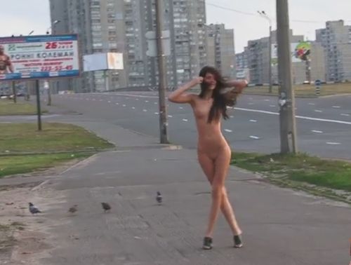 Голое дефиле длинноногой обнаженной девушки на улице в городе
